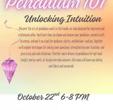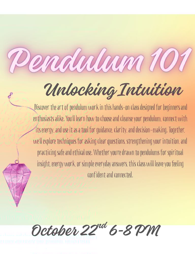 Discover the art of pendulum work in this hands-on class designed for beginners and enthusiasts alike. You’ll learn how to choose and cleanse your pendulum, connect with its energy, and use it as a tool for guidance, clarity, and decision-making. Together, we’ll explore techniques for asking clear questions, strengthening your intuition, and practicing safe and ethical use. Whether you’re drawn to pendulums for spiritual insight, energy work, or simple everyday answers, this class will leave you feeling confident and connected.