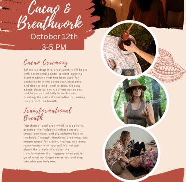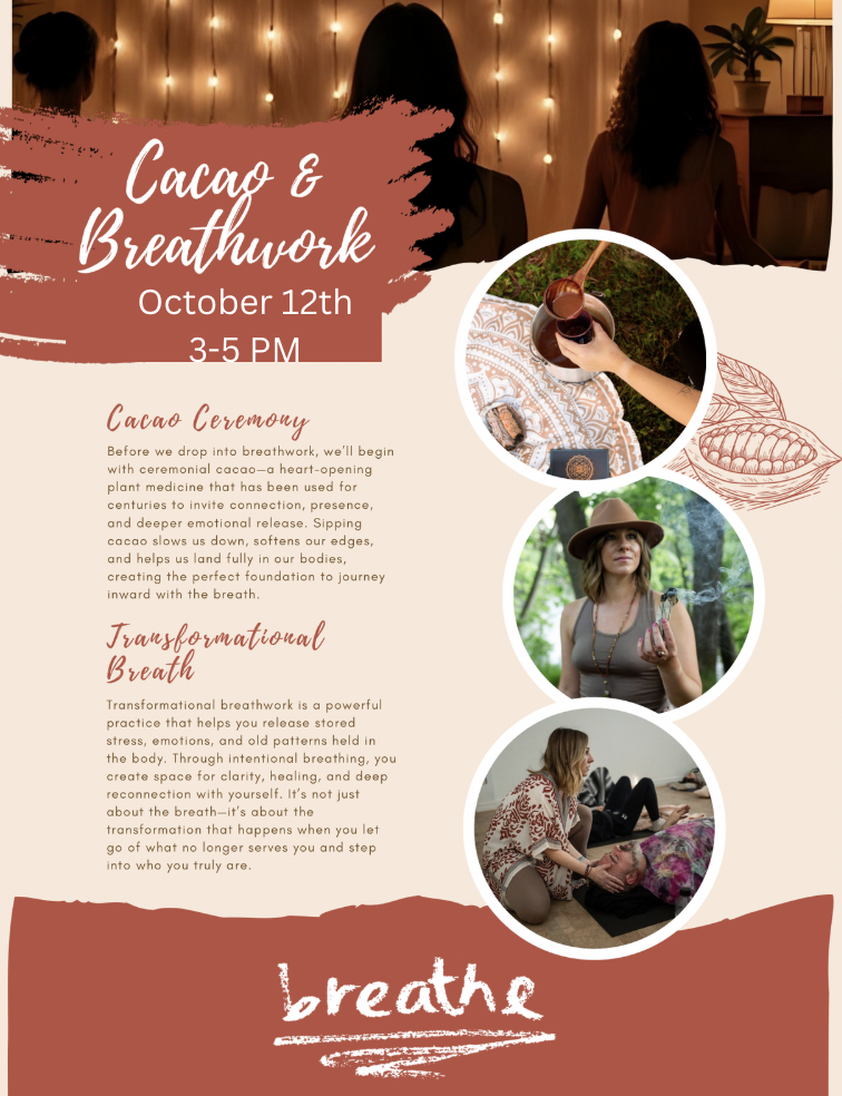 Step into sacred space as we gather to connect with the spirit of cacao and the power of the breath. This guided experience is designed to help you release, restore, and realign with your heart’s truth. Book here: https://forms.gle/zT3Ro9zUTQLssNVc6
